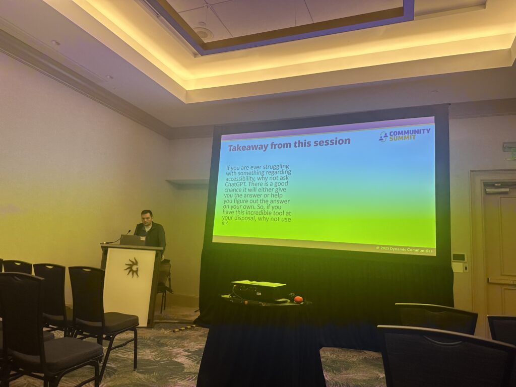 In “Unlocking Accessibility; Is AI the Key?”, Taylor Dorward, Independent Contractor, EquiTek Consulting, who is partially blind, explored how AI is transforming accessibility across daily life and the workplace. Sharing lived experience, Taylor demonstrated how tools like Microsoft Copilot and OpenAI ChatGPT go far beyond convenience. “It allowed me to be far more independent,” he said, describing how AI has become essential to everything from coding to navigation.