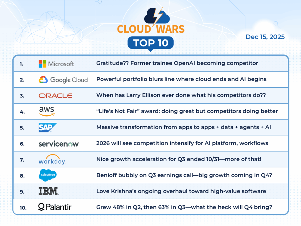 Overall, five of the nine Cloud Wars Top 10 companies that break out cloud revenue (IBM does not) saw those numbers accelerate relative to thei previous quarter: Palantir from 48% to 63%, Google Cloud from 32% to 34%, Oracle from 28% to 34%, AWS from 17.5% to 20%, and Workday from 14% to 14.6%.