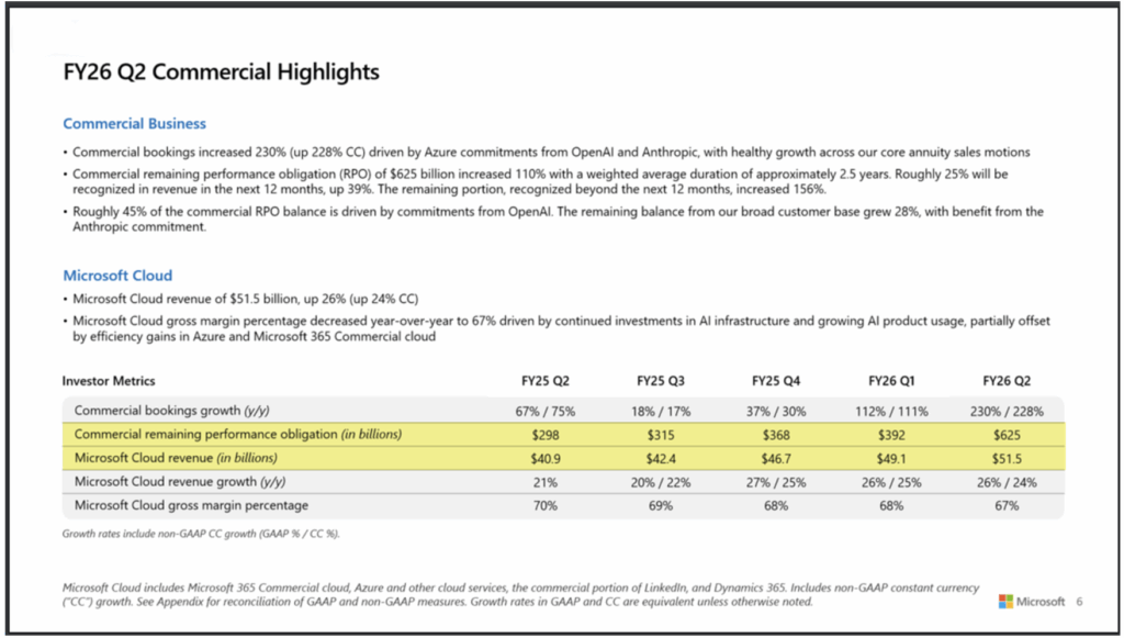Reflecting the astonishing and growing influence OpenAI holds over the world’s largest and most-influential cloud and AI providers, Microsoft’s Q2 RPO surged 110% to $625 billion propelled by future commitments from OpenAI totalling about $281 billion.