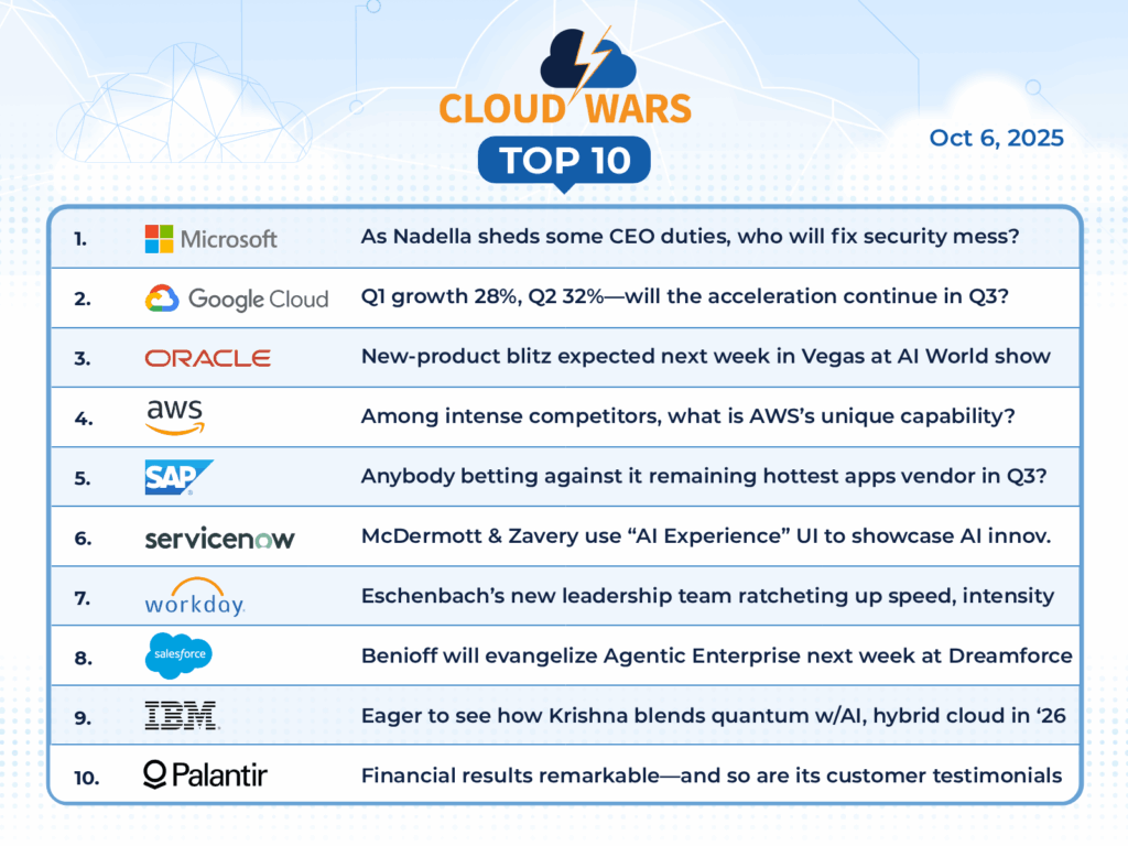 While I’m thrilled about the chance to begin analyzing Palantir and the remarkable results it’s generating for customers — you’ll find several examples below — I regret the need to say ‘so long’ to Snowflake, an outstanding company whose financial results and growth potential have been excellent. My decision to bring Palantir into the Cloud Wars Top 10 and move Snowflake out has nothing to do with any shortcoming on Snowflake’s part, but rather everything to do with Palantir performing at an even higher level and offering an even more-powerful example of why the Cloud Wars are the greatest growth market the world has ever known.